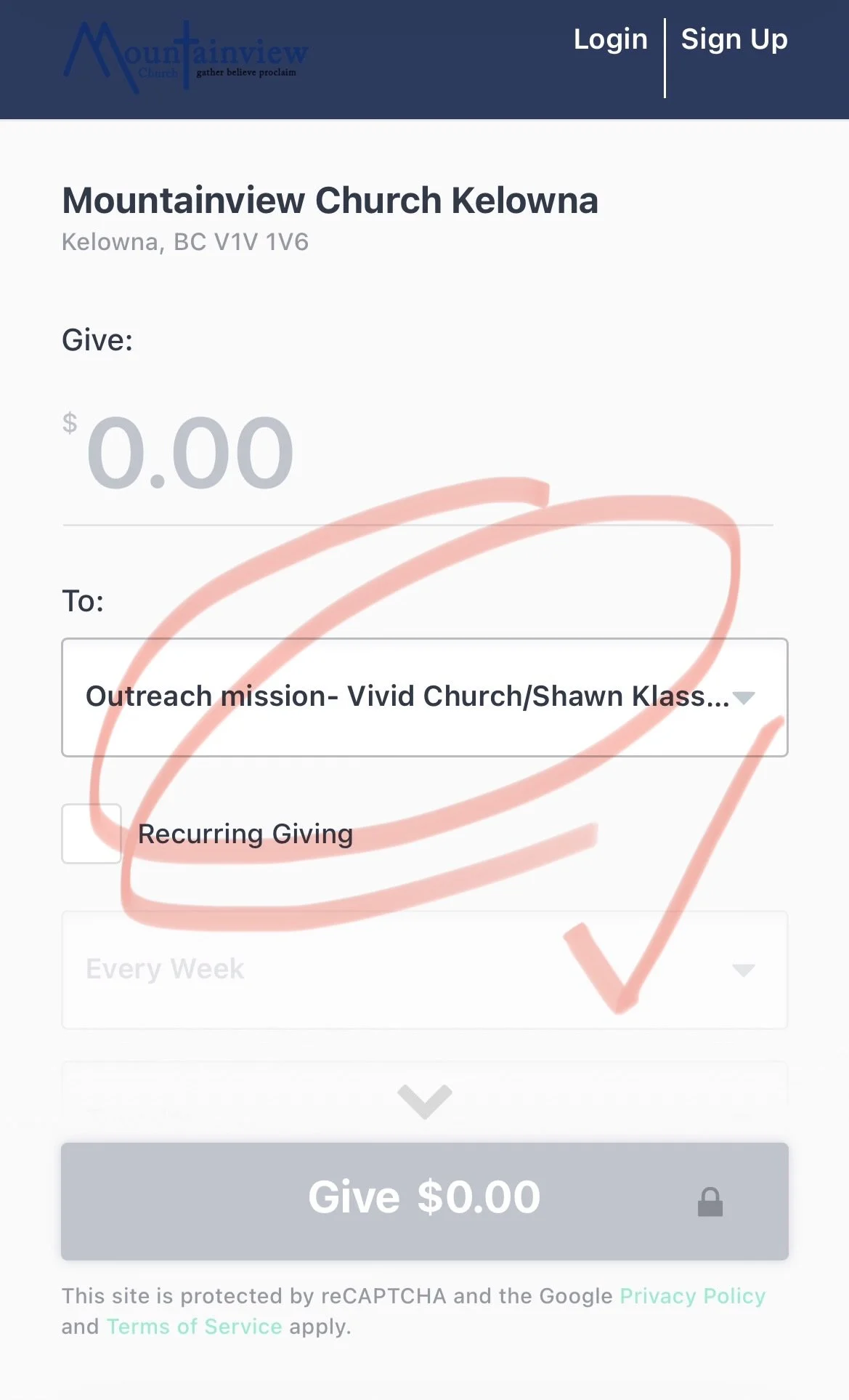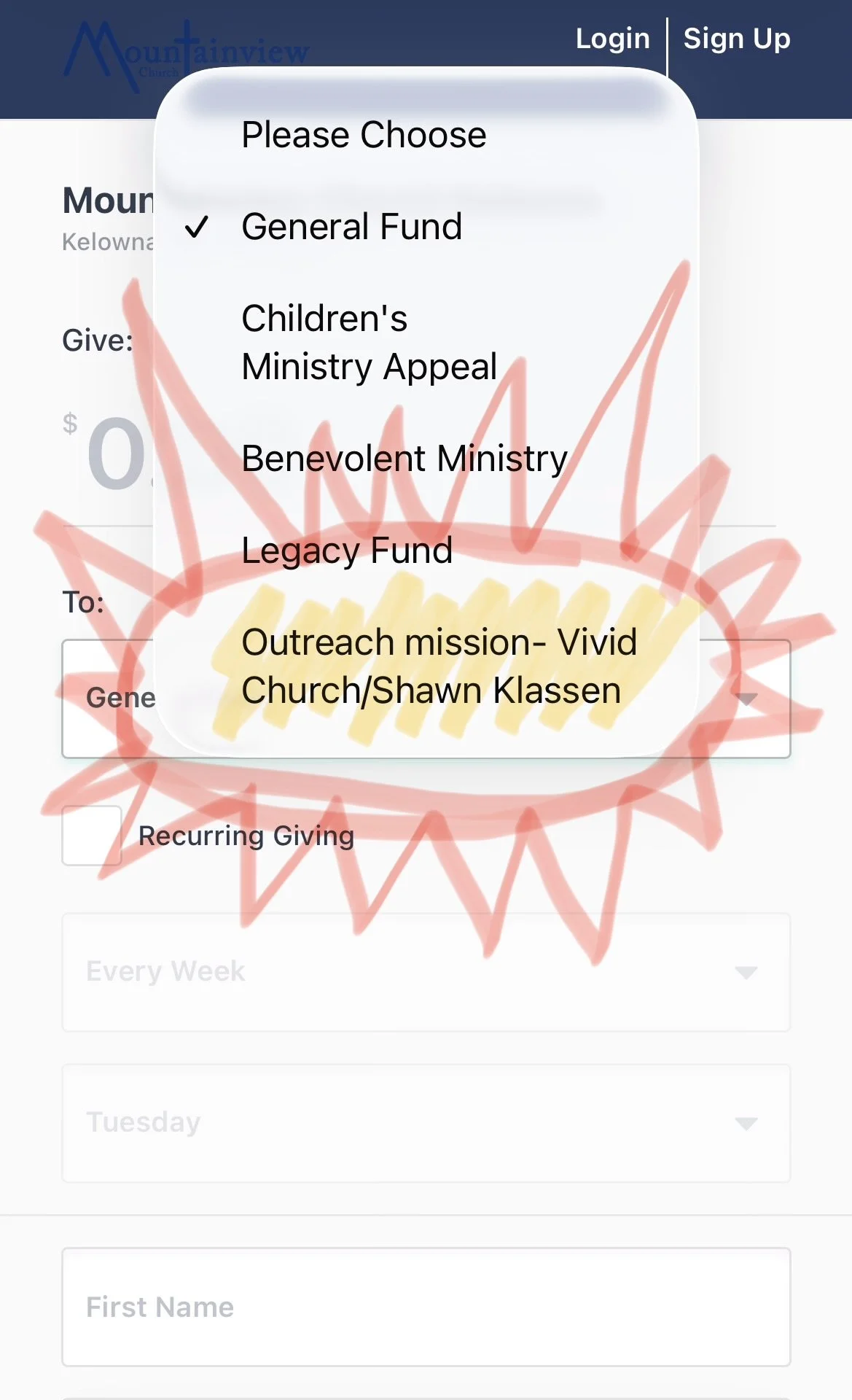 Click here - this will take you to the site for Mountainview Church’s Online Giving Option. To direct your gift to Vivid, use the drop down menu and select “Outreach mission - Vivid Church/Shawn Klassen”